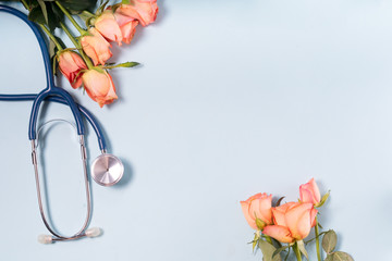Bouquet of flowers and stethoscope on a beige background, a place for text, happy doctors day, nurses week and other medical holidays.