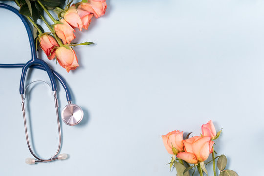 Flowers with mask and stethoscope on blue background. Happy nurse day concept. Top view