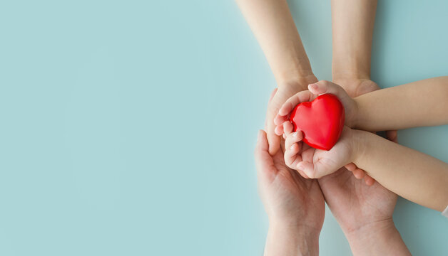 Happy Parents Day or International Day of Families. Happy mothers day. Mother and her childs holding Heart in the hands on blue background. Greeting card