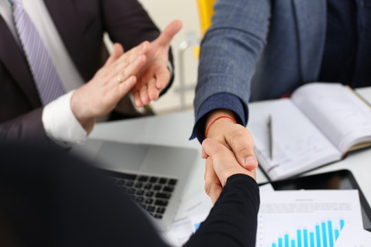 young happy businessmen have meeting in office shake hands with each other
