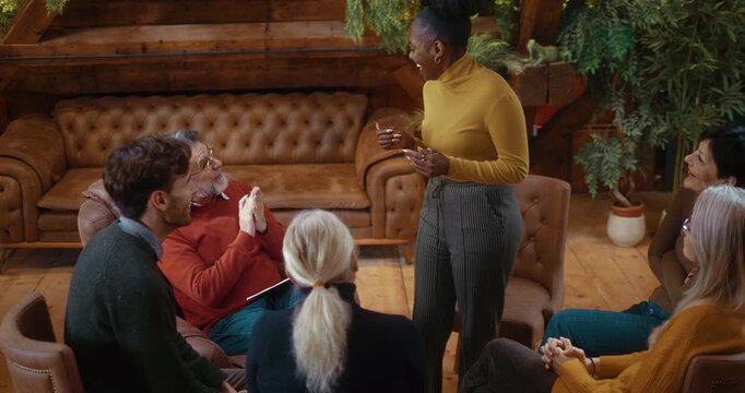 Confident and smiling black female participant standing and sharing her success story during group psychotherapy, receiving supportive applause from group in calm professional environment.