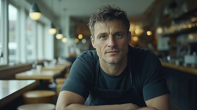 Man in cafe, seated, portrait,  blurred background of other patrons