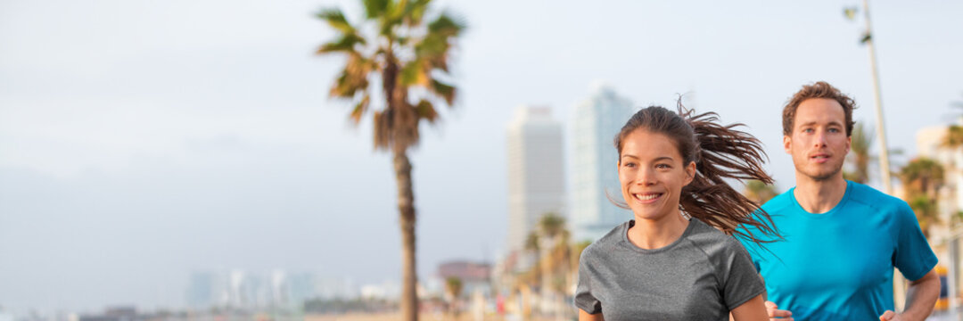 Sport banner athlete people running outdoor. Couple of fitness runners Asian woman and man jogging outside. Active healthy lifestyle.