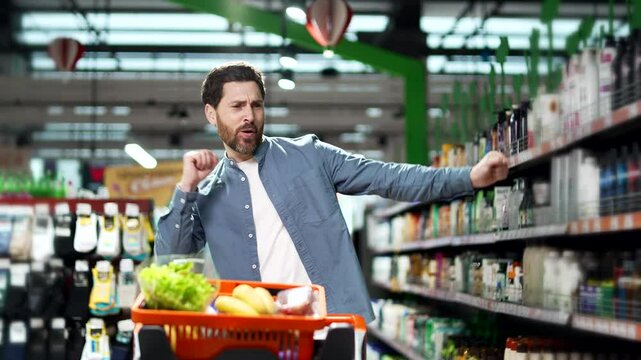 A happy shopper customer in a supermarket or grocery store cheerfully walks and dances between the rows in a shopping mall. Satisfied Male with a cart. Happiness and joy in a hypermarket aisle
