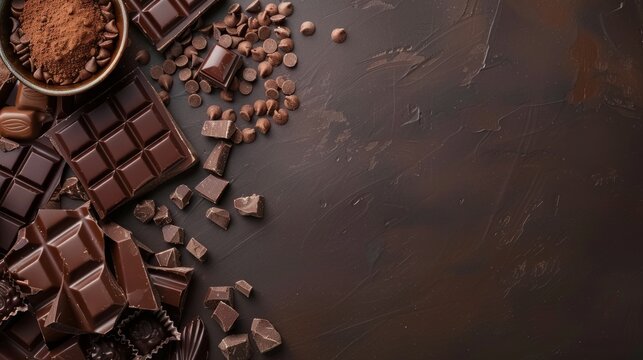 World Chocolate Day Concept. Various chocolates in dark color. Space for text. Banner, background, template. Happy chocolate day. Delicious background.