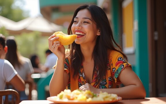 young latin woman eating mexican tacos on a restaurant terrace in Mexico Latin America, feeling happy on a summer day. High quality