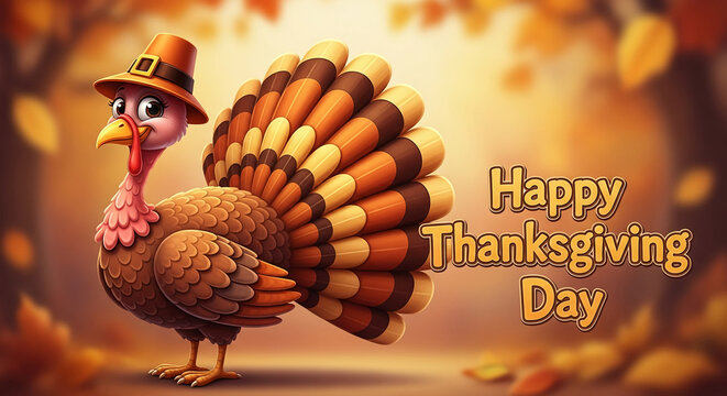 Cartoon turkey wearing pilgrim hat, brown and orange feathers, autumn background, "Happy Thanksgiving Day" text, festive illustration perfect for Thanksgiving greetings