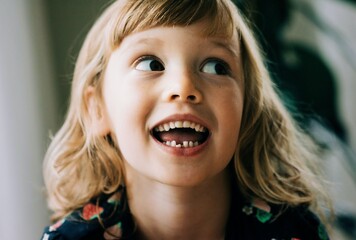 young girl smiling showing her wobbly tooth looking happy