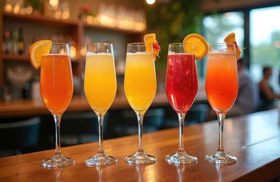 Five champagne flutes with colorful mimosas and orange slices are arranged on bar counter. Drinks feature bubbly liquid and fruit garnishes for special occasion.