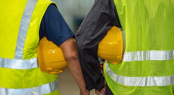 Yellow hard safety helmet hat for safety project of workman as engineer on together joining concept at construction site background.