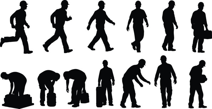 Construction worker silhouettes in hard hats, twelve poses walking, carrying, lifting, bending, job site labor actions, vector illustration set collection