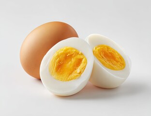 A whole brown egg and a halved hard-boiled egg with a bright yellow yolk sit on a plain white background