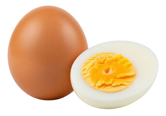 A whole brown egg and a halved hardboiled egg showing the yolk and white, isolated on transparent background
