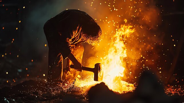 Blacksmith forging metal with a hammer in front of a fiery forge, showcasing traditional metalworking skills and intense firelight.