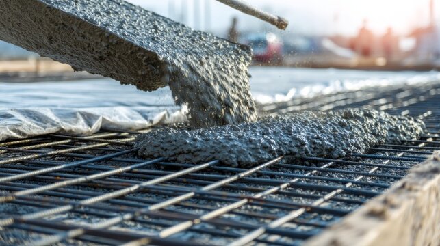Concrete pouring over reinforcement bars in construction site