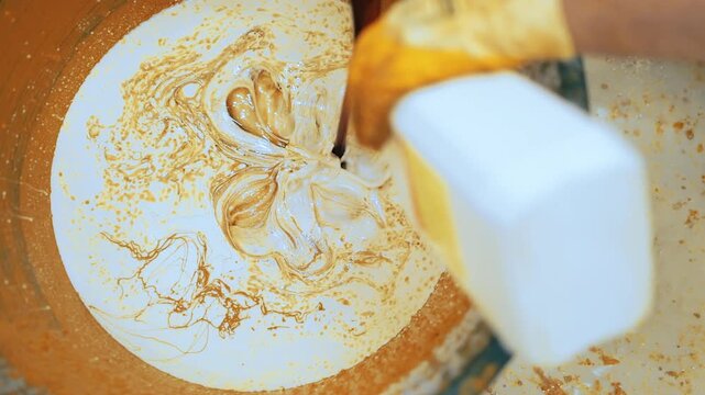 Worker mixing epoxy resin and hardener for polyurethane concrete flooring
