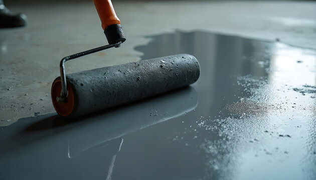 Roller applies grey sealant to concrete floor surface. Protects, coats, and smooths industrial or home improvement projects. Seamless, hard-wearing finish for durable flooring.