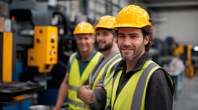 Safety Meeting: Workers in protective gear listen to speaker on the manufacturing floor, emphasizing safety and training in the industrial workplace.