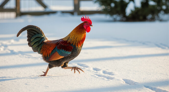 Rooster walking in snow creating footprints across winter field, brilliant plumage sparkles under sun. Rooster walking in snow embodies hardiness and rural resilience.