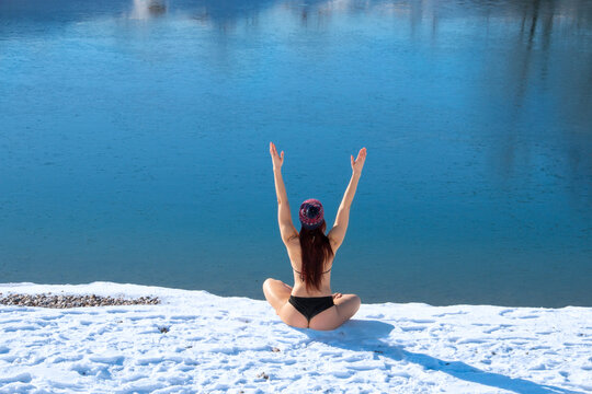 Winter hardy woman back view body with raised hands up on snow - white bank of the blue lake background copy space