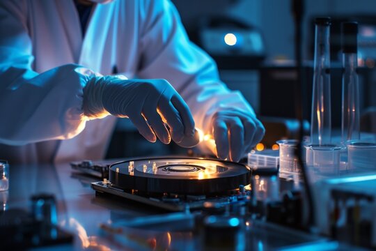 Electronics engineer at work. Image shows a professional in a lab with electronic testing equipment and computers, engrossed in analyzing or repairing circuit boards.