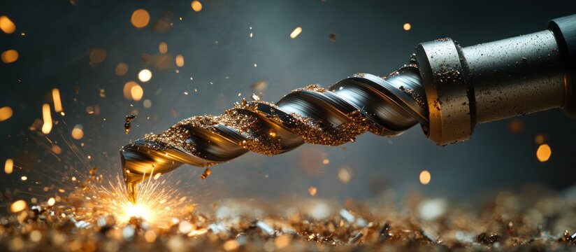 A close-up of a drill bit creating sparks while drilling into metal shavings.