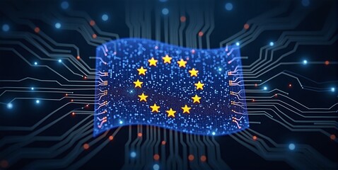 A circuit board forms a European flag showing digitization in europe– ai generated