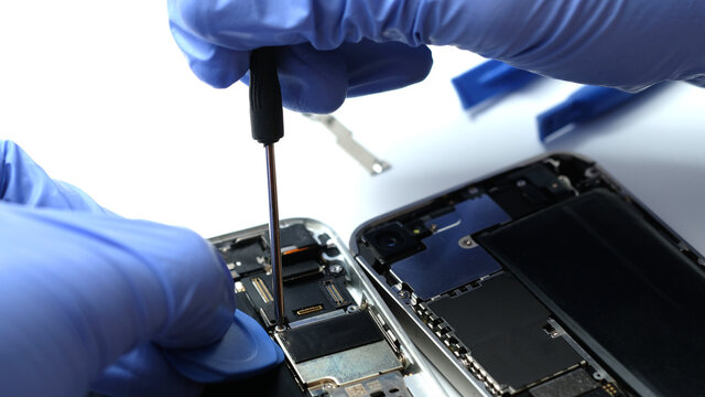 Technician repairing the Cell phone parts and tools for recovery repair phone smartphone and upgrade mobile technology,the concept of computer hardware inside.