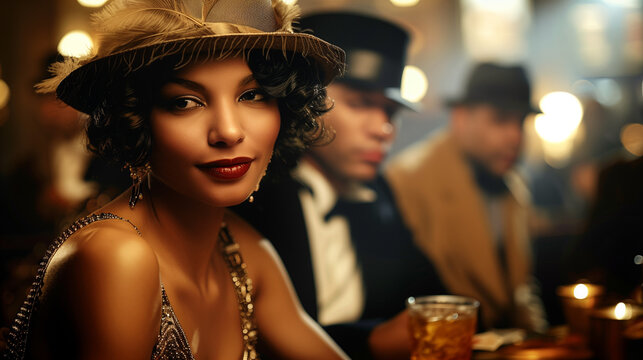 a stylish black woman at a 1920s bar, capturing the essence of classic Hollywood glamour and the Harlem Renaissance with dark amber tones and lively tavern scenes in the background.