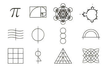 Sacred Geometry Icons. Line style icons of sacred proportions and symbols: phi symbol, golden rectangle, sacred cube, spiritual