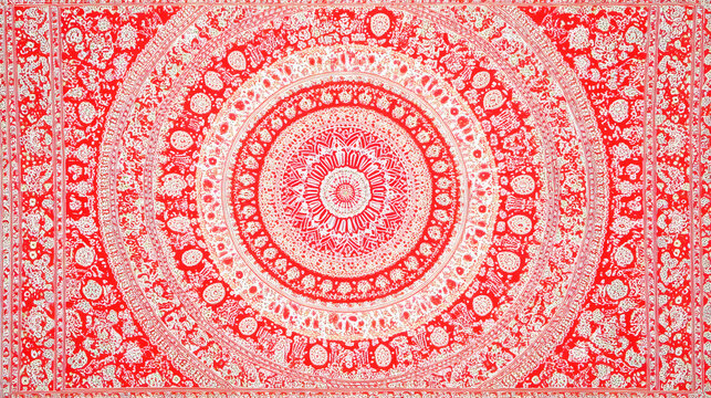 A symmetrical mandala-like design with intricate details and bright, harmonious colors radiating outward in balanced patterns