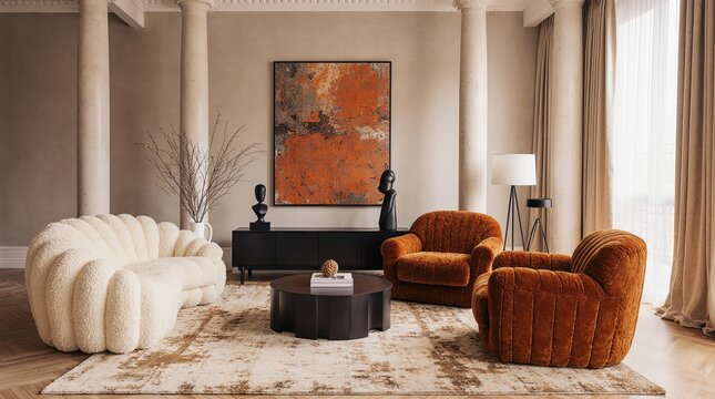 Modern Interior Design: An inviting living space, artfully designed with a fusion of contemporary elements, features elegant furnishings and a harmonious color palette.