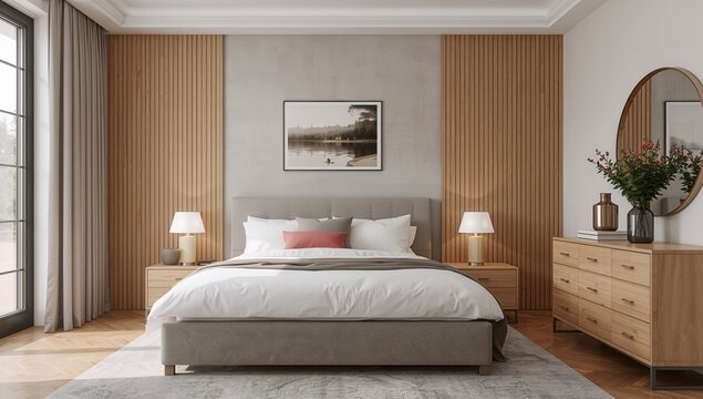 Serene Slumber, Subtle Shades. A Quiet Bedroom Interior, Where Light and Form Harmonize.