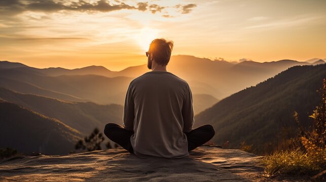 Man meditating yoga at sunset mountains Travel Lifestyle relaxation emotional concept adventure summer vacations outdoor harmony with nature