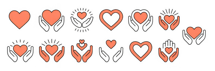 Vector icon set of hearts and hands in outline and filled styles showing care love support donation and charity for healthcare nonprofit and social apps. Caring Hands with Heart Line Icons Minimal.