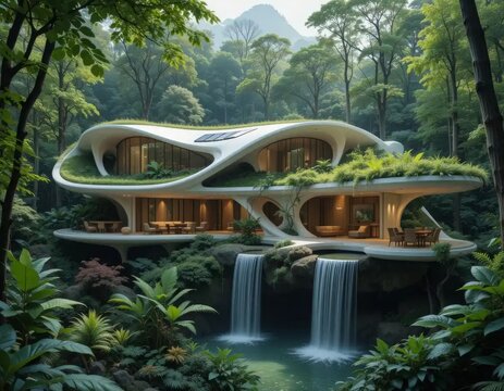 Warm terracotta wall contrasts with lush greenery and tranquil p