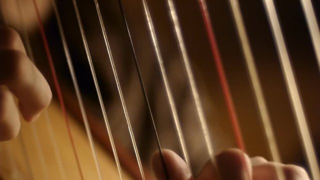 Cinematic Closeup of the Hands of a Female Harpist Playing Harp Solo Gracefully in a Dark Stage. Professional Musician Rehearsing Before the Start of a Big Show