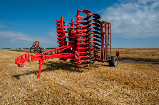 Red harrow folded for transportation for cultivating the land. Harrow on the field and beautiful sky background