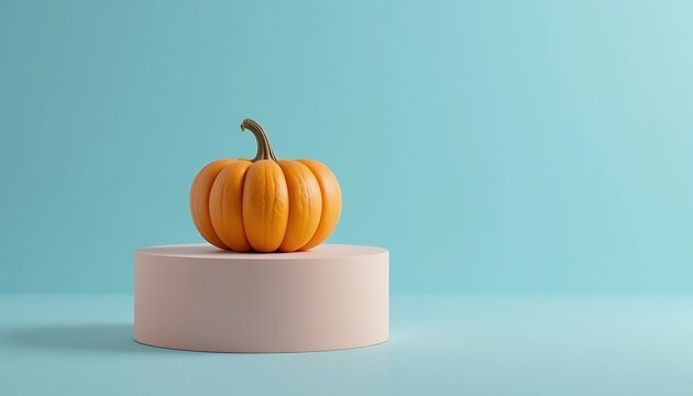 Autumn harvest celebration a single ripe pumpkin rests on a pedestal against a soft blue background
