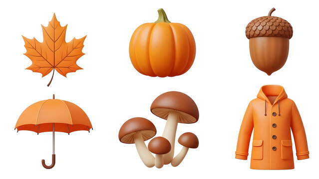 Orange Icons Set Featuring Pumpkin, Umbrella, Acorn, Leaf, and Mushrooms in a Cozy Nature Environment