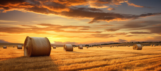 Rural farm background with hay bales at sunset. Rustic countryside view with a stunning sunset above a vast field of rolled straw
