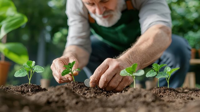 Elderly man planting coins in a garden, representing pension investment growth over time silver economy, pension growth concept