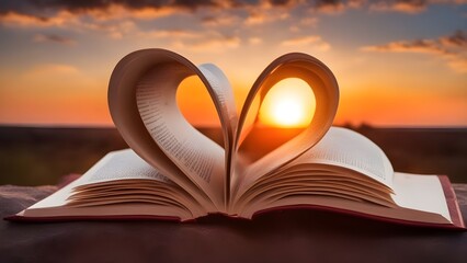 book with heart A book page shaped into a heart with a sunset in the background. The book page has some sentences