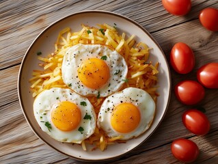 Golden Hash Browns Topped with Fried Eggs, Seasoned and Garnished, Great for Brunch Menus