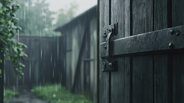 hasp. Weathered barn door with a heavy metal hasp swaying in a rainy atmosphere. real-estate listings, architecture portfolios, designed for architectural facade and classical detail presentations.
