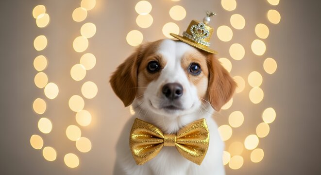 Cute dog wearing a sparkly gold top hat and a shimmering golden bow tie set against a background of soft blurred yellow lights Puppy Adorable Animal Pet