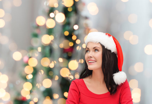 Happy young woman or girl making snow angel lying on snow, copy space for banner design.
