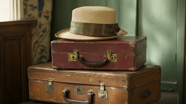 A vintage suitcase and hatbox stacked together, evoking the romance of old-fashioned travel