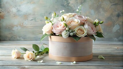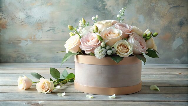 Elegant pastel roses arranged in a hatbox on a rustic wooden surface