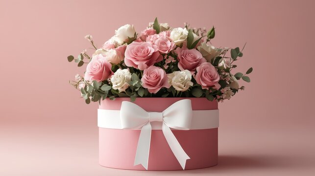 Elegant floral arrangement in pink hatbox with bow for romantic decor and gift ideas
